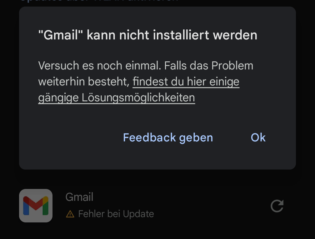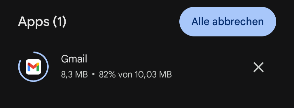 Ich habe seit heute das Problem, dass die Gmail-App nicht über den Play Store aktualisiert werden kann. Das Update lädt bis 82%: