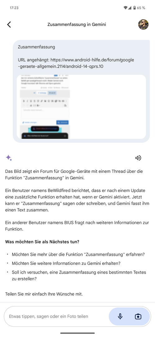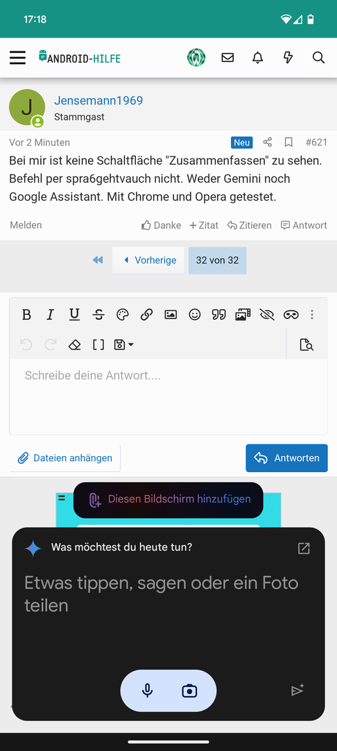 Bei mir ist keine Schaltfläche "Zusammenfassen" zu sehen. Befehl per spra6gehtvauch nicht. Weder Gemini noch Google Assistant. Mit Chrome und Opera getestet.