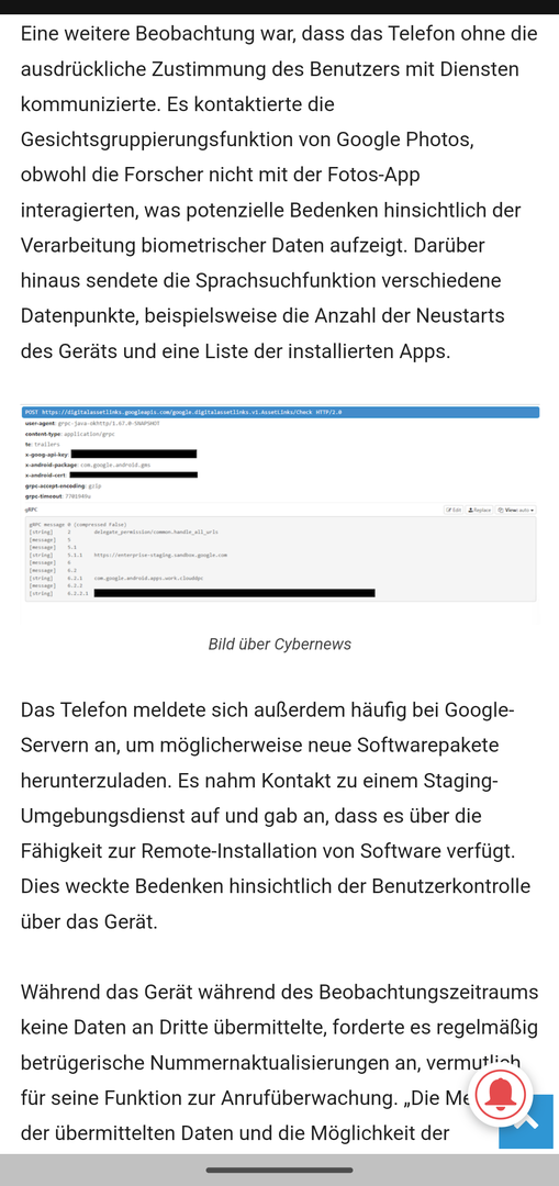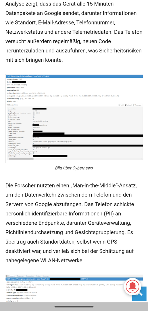 Moin, es ist ein aktueller Fall aufgetaucht, nachdem wohl das Pixel 9 Pro XL alle 15 Minuten lang alle möglichen Daten, ohne jegliche Berechtigungen, an die Google Server sendet.