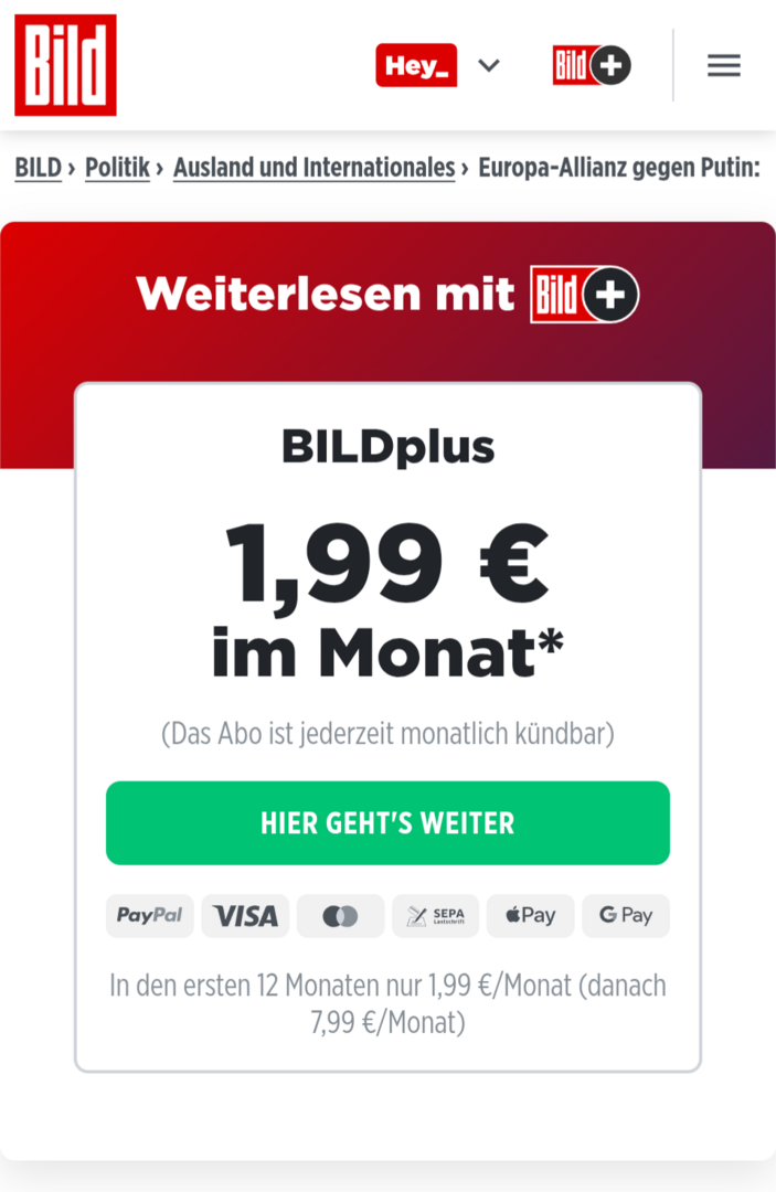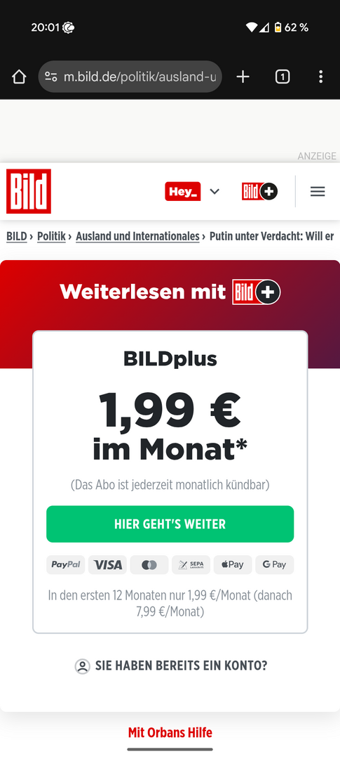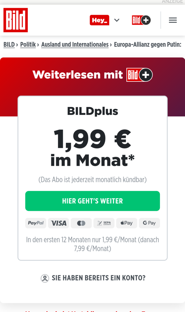 Wenn ich einen Bildplus Artikel aufrufe, kann ich mit nicht in mein betsehendes Konto einloggen.