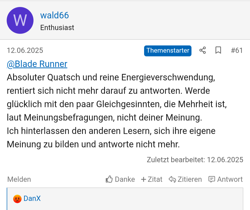 Absoluter Quatsch und reine Energieverschwendung, rentiert sich nicht mehr darauf zu antworten. Werde glücklich mit den paar Gleichgesinnten, die Mehrheit ist, laut Meinungsbefragungen, nicht deiner Meinung.