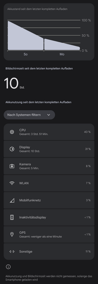 Bin nun mit dem Pixel 10 Pro auf über 31 Stunden Mischbetrieb mit 3:45 Stunden SOT gekommen und habe noch 14% übrig - so eine gute Laufzeit hatte ich bei noch keinem Pixel.