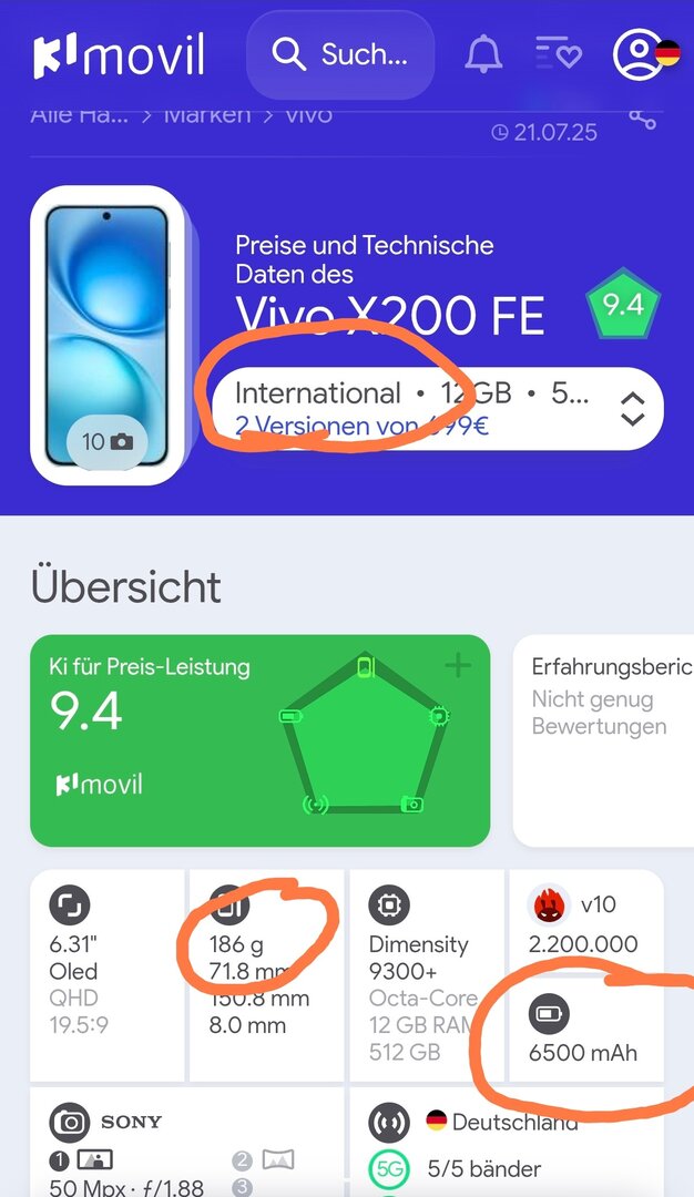 Und dann kommt Vivo mit dem X200 FE und packt ein 6500 mAh Akku in sein flacheres 6,3" Gerät und wiegt nur 186g.