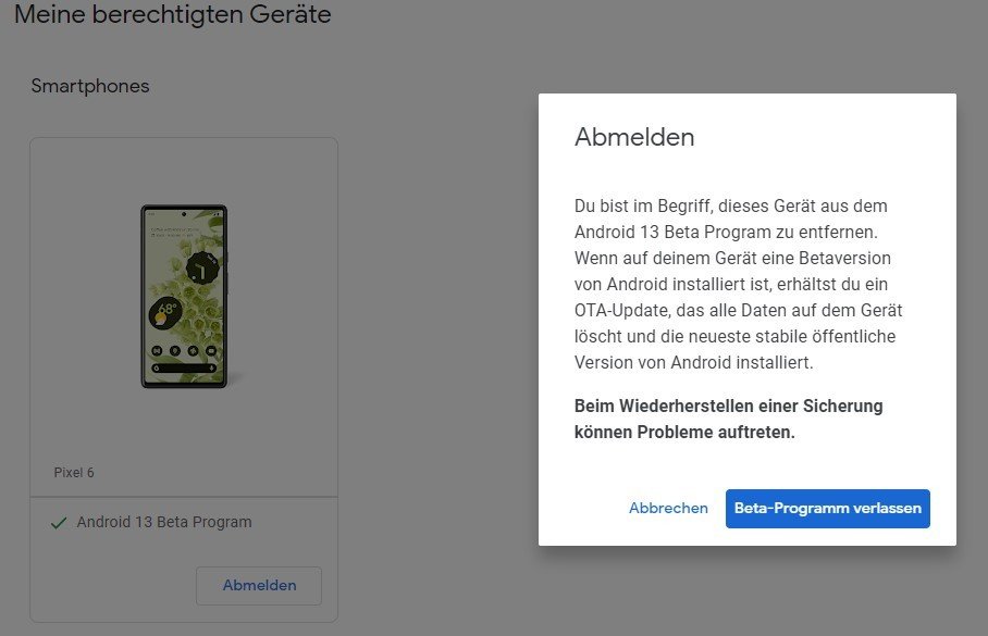 Wer die finale Android 13 hat und sich noch im Beta Programm befindet, sollte sich abmelden, sofern man kein Beta Tester mehr sein will.