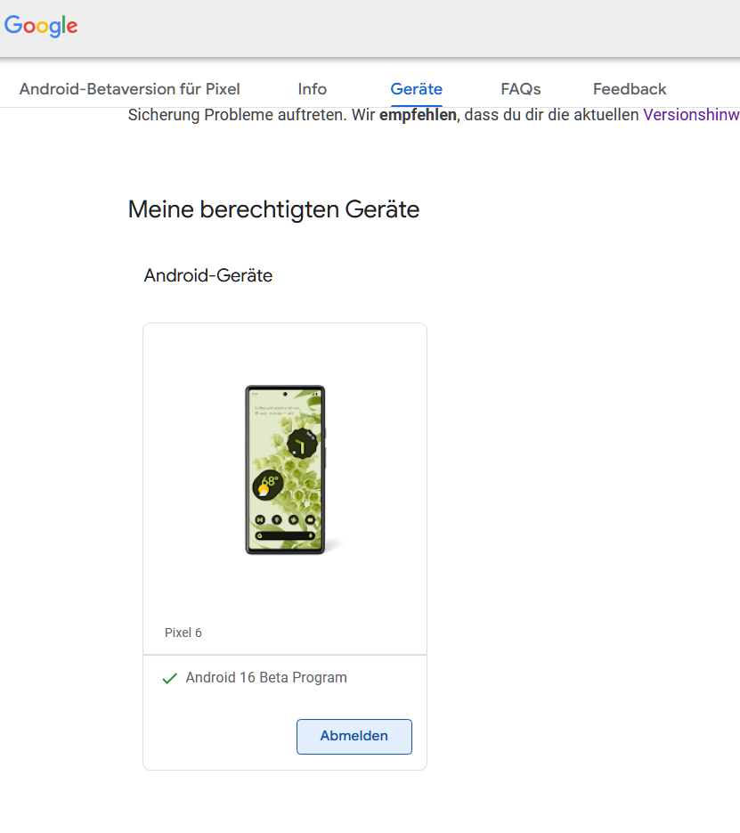 Hier kann ich sehen, dass das Telefon offenbar für Beta-Releases angemeldet ist.