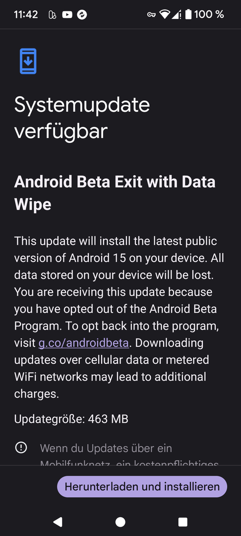 Du bist im Begriff, dieses Gerät aus dem Android 16 Beta Program zu entfernen. Wenn auf deinem Gerät eine Betaversion von Android installiert ist, erhältst du ein OTA-Update, das alle Daten auf dem Gerät löscht und die neueste stabile öffentliche Version von Android installiert. Wenn du dich dafür entscheidest, kein Update auf die neueste öffentliche Version durchzuführen, und dein Gerät nicht für das Programm angemeldet ist, erhältst du automatisch die Aktualisierung auf die nächste stabile Version, die du betatestest, sobald sie öffentlich verfügbar ist. Je nachdem, wann du dich während des Betaprogrammzyklus abgemeldet hast, kann dies bis zu 3 oder 4 Monate dauern. Das Installieren des endgültigen öffentlichen Release der von dir getesteten Betaversion führt nicht dazu, dass die Daten auf deinem Gerät gelöscht werden.