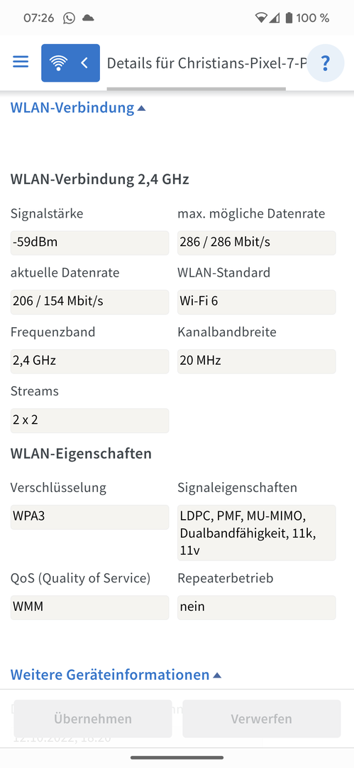 Hier Google Pixel 7 Pro - Full phone specifications habe ich nur Folgendes gefunden: Wi-Fi 802.11 a/b/g/n/ac/6e, tri-band, Wi-Fi Direct
