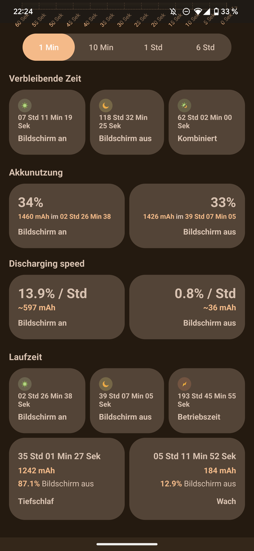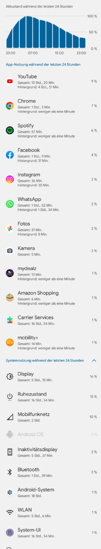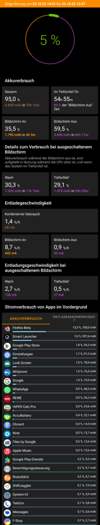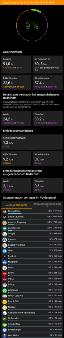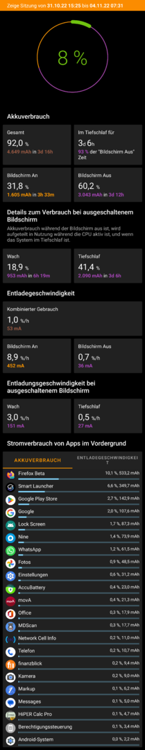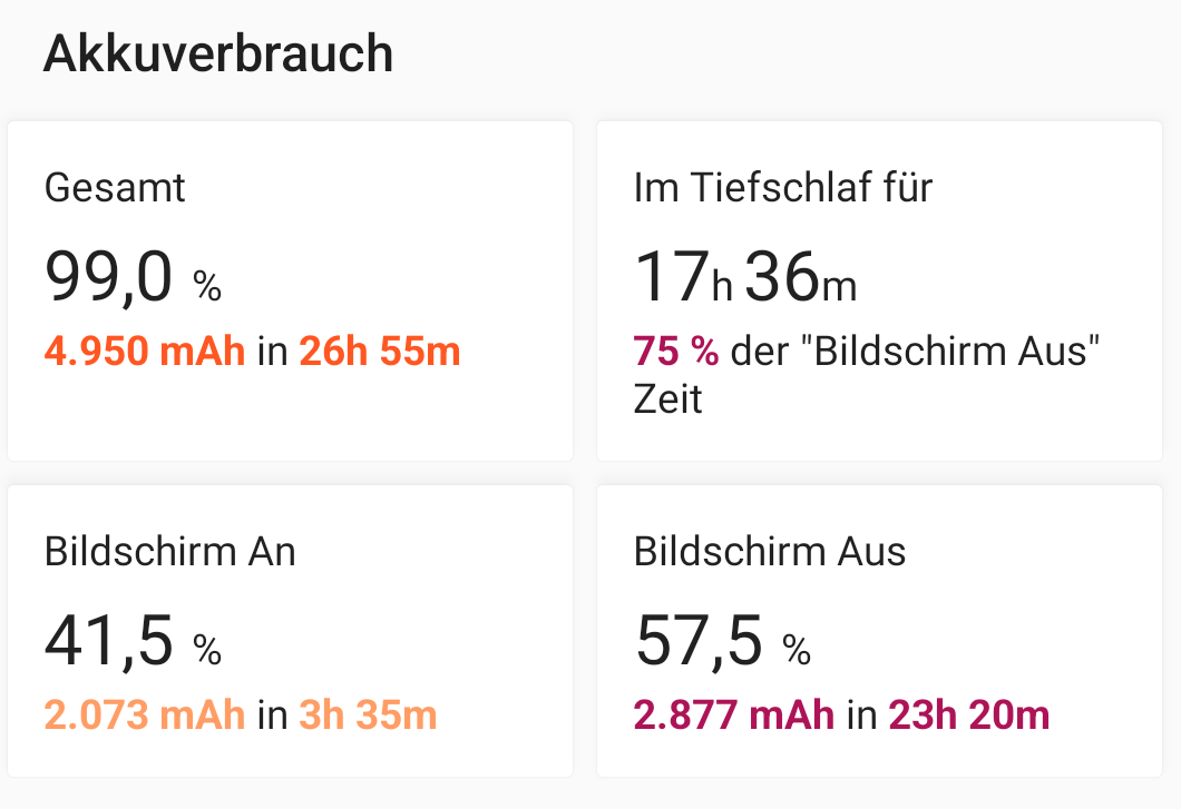Laut AccuBattery habe ich einen Verbrauch im Tiefschlaf von 1,4%/h und bei Display aus knapp 2%/h. Zudem ist das Gerät nur 70% der Display aus Zeit im Tiefschlaf...