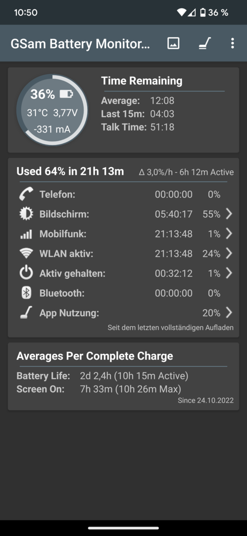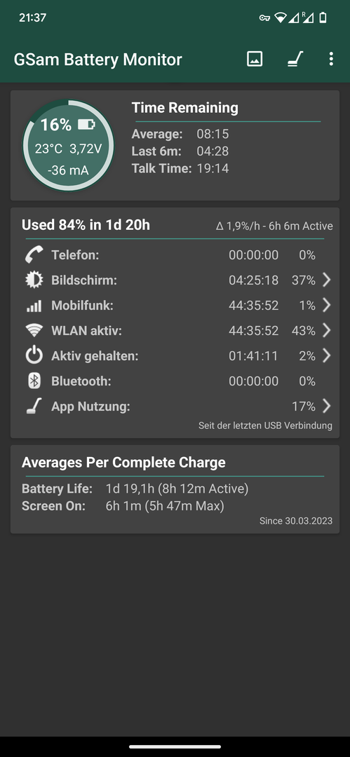 Das halte ich aber für einen Bug in GSM Battery Monitor. Denn auch auf meinem uralten Samsung Galaxy Tab S zeigt GSM plötzlich einen absurd hohen Wert bei WLAN.galmi schrieb:Mein größter Verbraucher ist laut GSM Battery nun übrigens das WLAN mit 40% (ich bin hier fast die ganze Zeit neben dem Router mit super Empfang) gefolgt vom Ruhezustand mit 20%.
