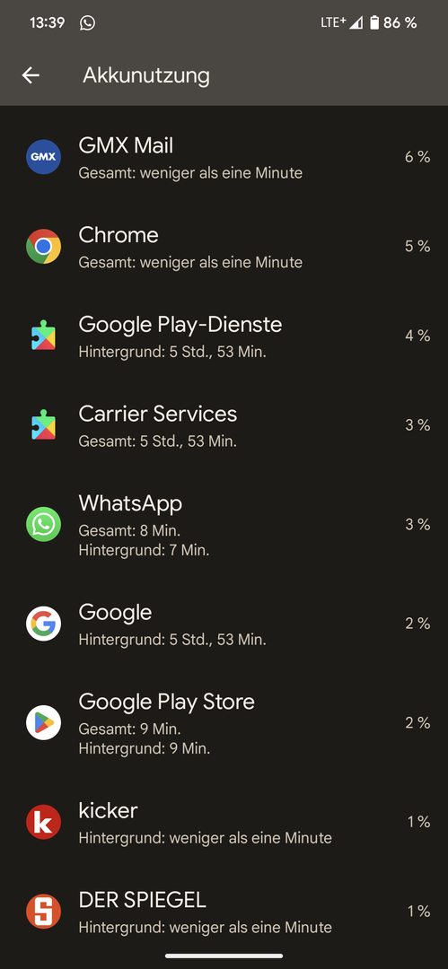 Naja, da steht "weniger als eine Minute", also quasi nahezu gar nicht genutzt bzw. in der Summe der Apps sehr wenig. Da ist der Verbrauch in etwas über 5h schon recht hoch. Hochgerechnet auf nen Tag wären das ja über 60% für nahezu Nicht-Nutzung". Bleibt halt noch die Frage, ob's die ganze Zeit im WLAN war, oder Mobil etc.komolze schrieb:wo ist da was verdächtig?