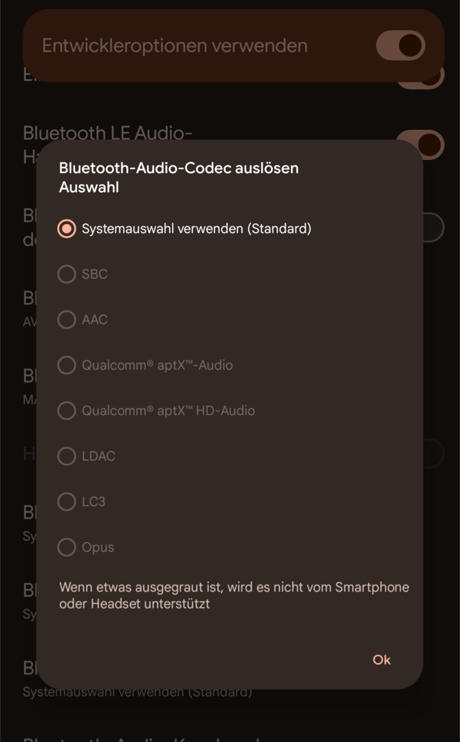 Das Pixe 7 Pro soll per technischer Spezifikation den BT Codec aptx HD unterstützen. Der lässt sich in den Entwickleroptionen, neben einigen anderen auch, anwählen. Eigentlich. Die ganze Liste ist bei mir ausgegraut, außer der erste Punkt (Systemauswahl verwenden (Standard). Warum ist das so?