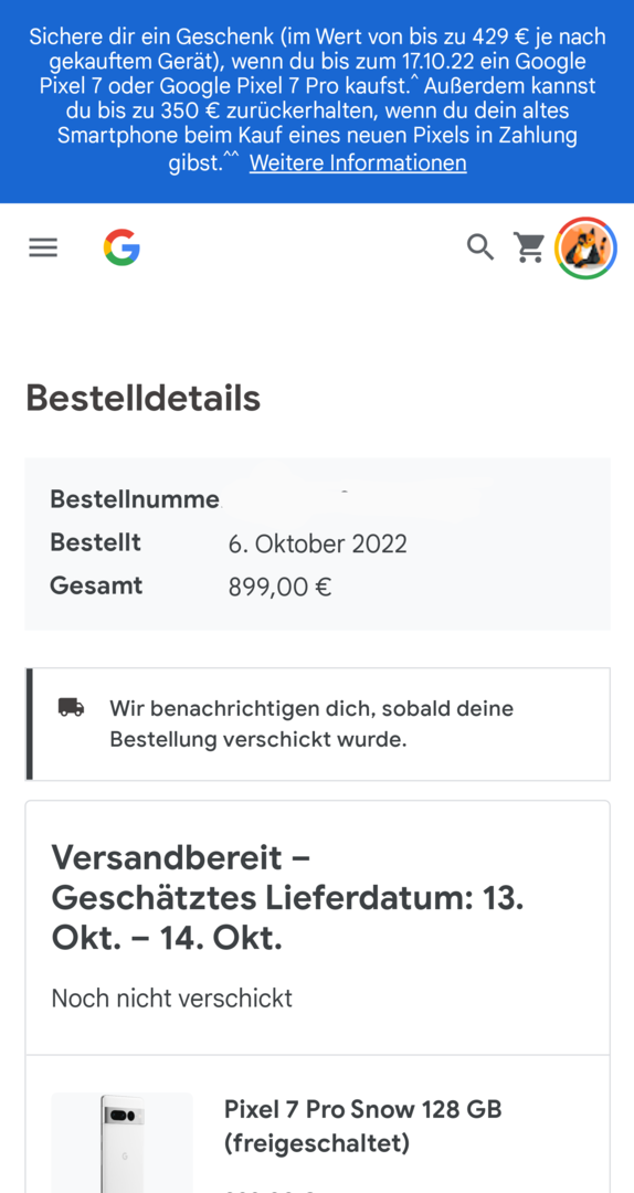 Nein! Skandal! Es ist tatsächlich um zwei Tage nach hinten gerutscht.FizzlePizz schrieb:Lieferung sollte zuerst am 13ten erfolgen, ist jetzt aber auf den 14.10. bis 15.10. gesprungen!