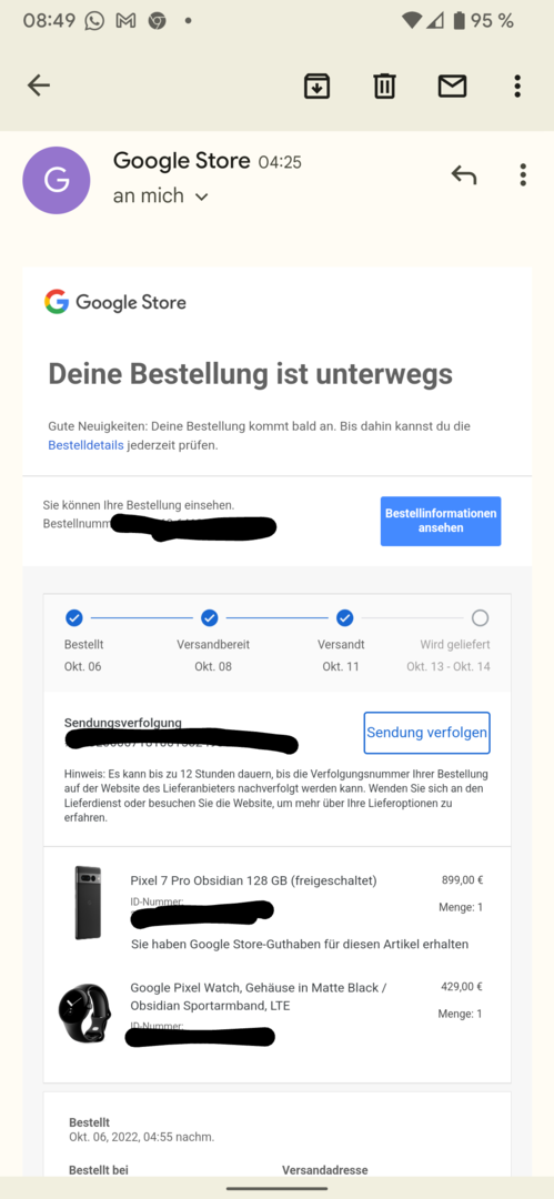 Normale Sendung (Obsidian 128GB, geht dann wieder zurück) steht auf Abholung.