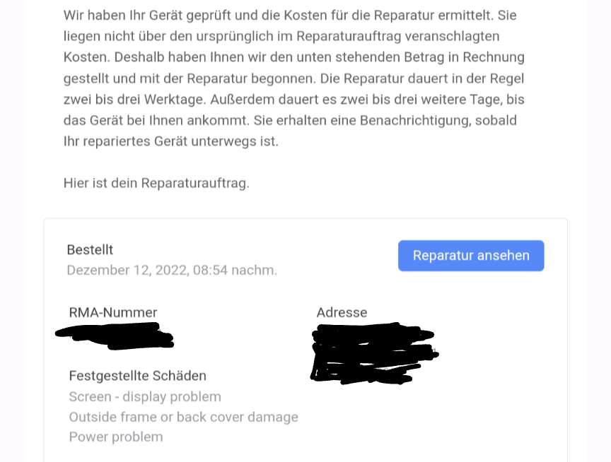 Das Gerät ist gestern bei Google angekommen und wurde bereits geprüft. Interessanterweise wurden noch zwei "Mängel" ergänzt, welche ich nicht genannt habe. Allerdings erhöhen diese nicht den Preis.