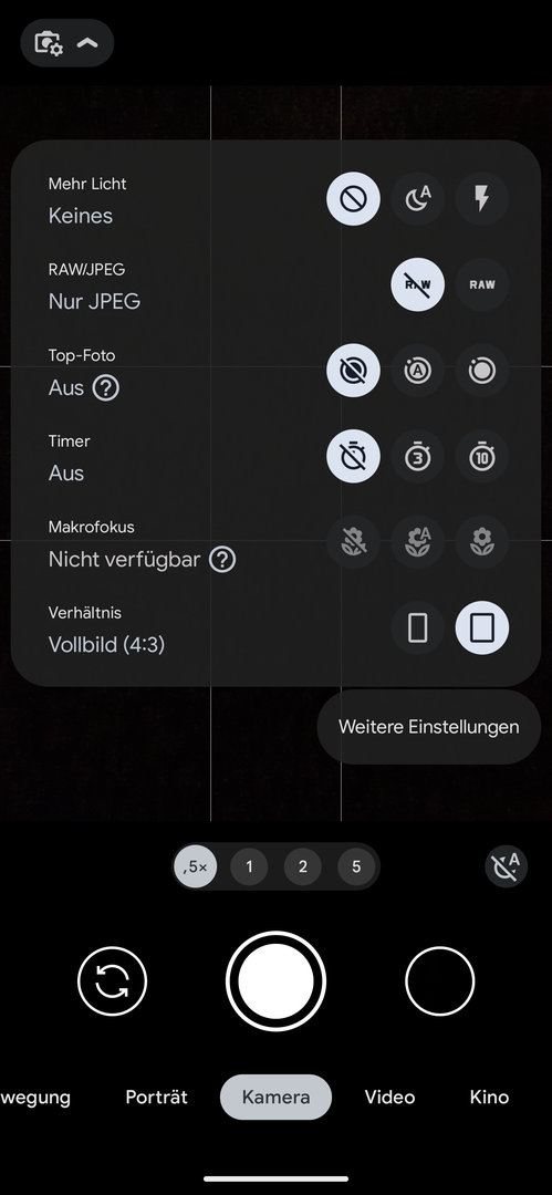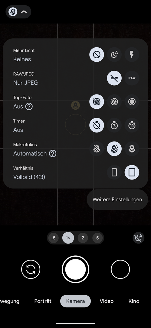 hier läuft die normale Google Kamera-App, Version 8.9.097. Eher durch Zufall ist mir aufgefallen, dass das Weitwinkelobjektiv keine Makro-Funktion (mehr) hat. Bei den Einstellungen steht 'Nicht verfügbar' (Screenshot 1). Die Haupt- und die Telekamera haben beide eine Makro-Funktion (Screenshot 2).