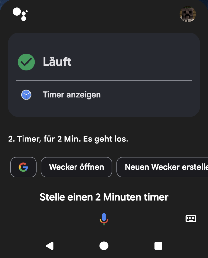 Sage ich „Ok google, stelle einen 5 Minuten Timer“, passiert nichts, außer die Anzeige auf dem Bildschirm mit der Bitte auf das Mikrofon zu tippen.