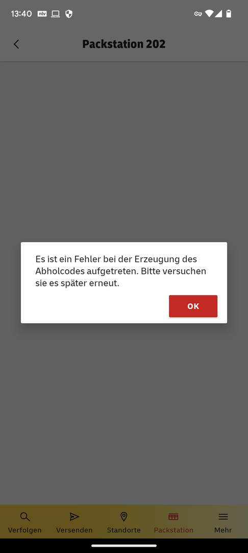 Ich hab ein Paket noch in der Packstation, auf dem Pixel 5 wird mir der Abholcode generiert, auf dem Pixel 7 bekomme ich den folgenden Fehler: