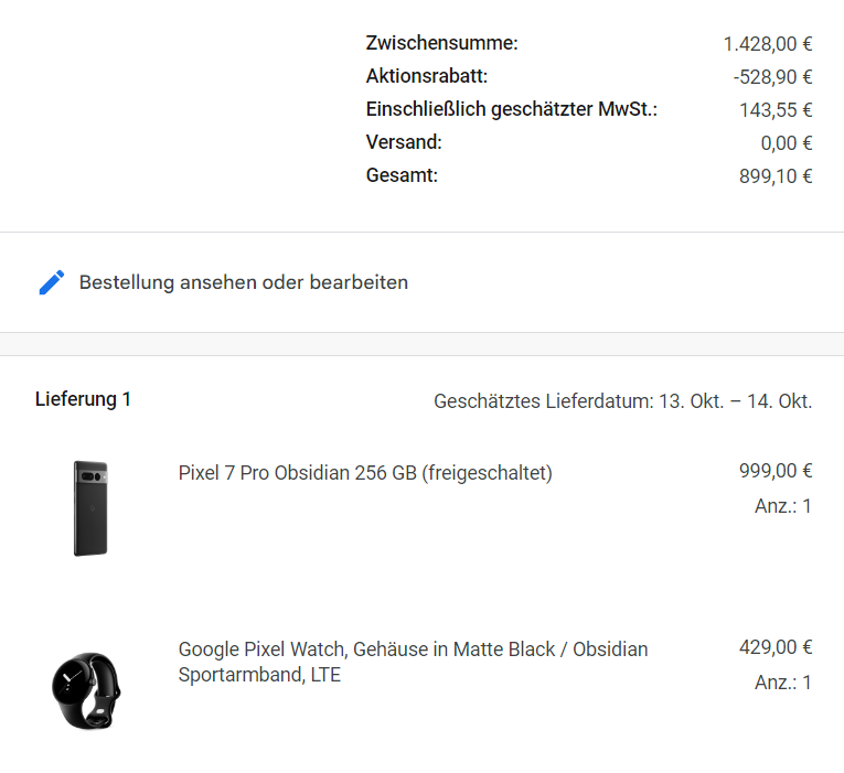 Werden wohl zusammen Versand.andrgr schrieb:Werden bei Bestellung direkt über Google die Buds bzw. die Uhr gleich mit dem Smartphone gemeinsam versendet oder auch erst später, wie wenn man z.B. bei Amazon kauft?