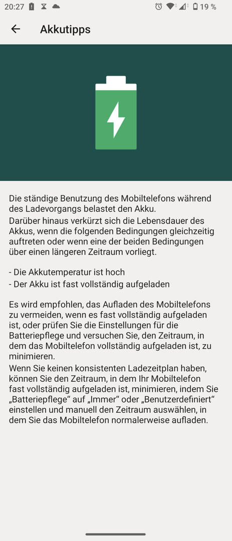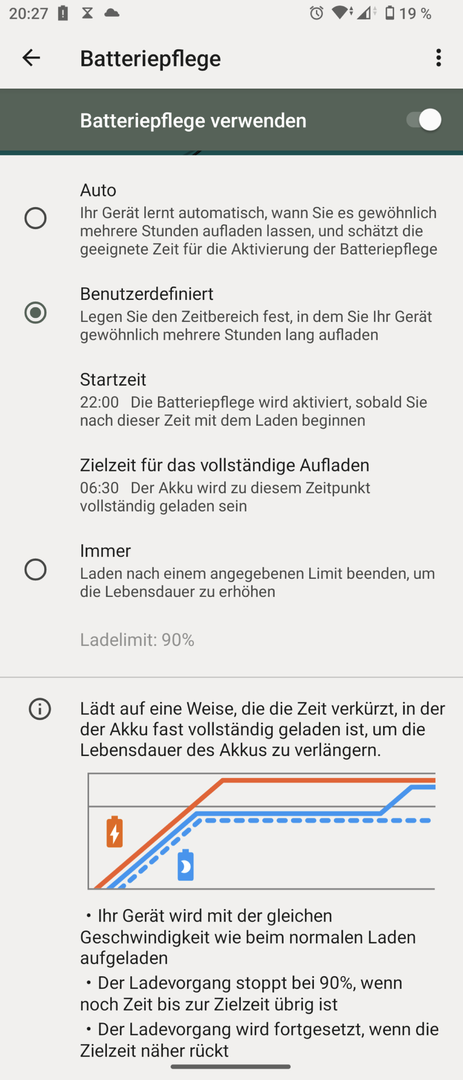 Ich fürchte das wäre ziemlich nutzlos, wenn man dann die Powerbank mitnehmen muss, weil man sonst nicht über den Tag kommt. Zumindest ist das mein Eindruck von manch Erfahrung hier.maik005 schrieb:Manuell fest einstellen zu können, dass es nur bis ca. 80% lädt wäre nett.