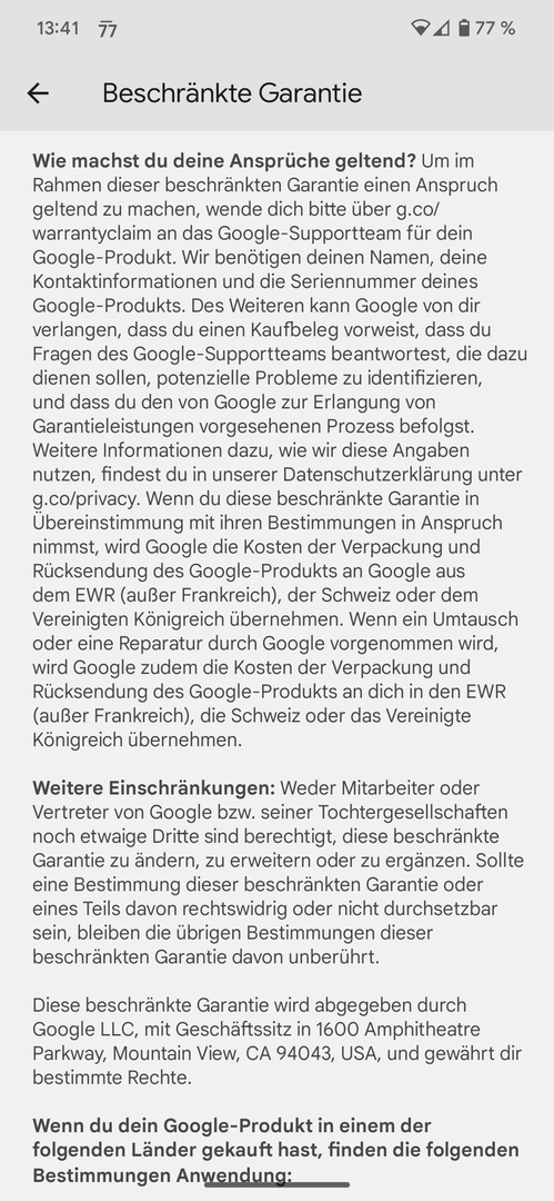 Was deckt die Garantie ab und wie lange ist diese gültig? Google garantiert, dass das Google-Produkt bei normaler Nutzung, wie in den veröffentlichten Produktinformationen beschrieben, für zwei Jahre ab dem Datum, an dem du es ursprünglich im EWR (außer Frankreich), in der Schweiz oder im Vereinigten Königreich erworben hast, frei von Material- und Verarbeitungsfehlern ist ("beschränkte Garantie").