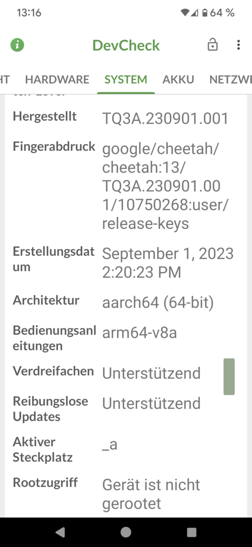 Sicherheitsupdates und Google Play Systemupdates sind auf Stand September.