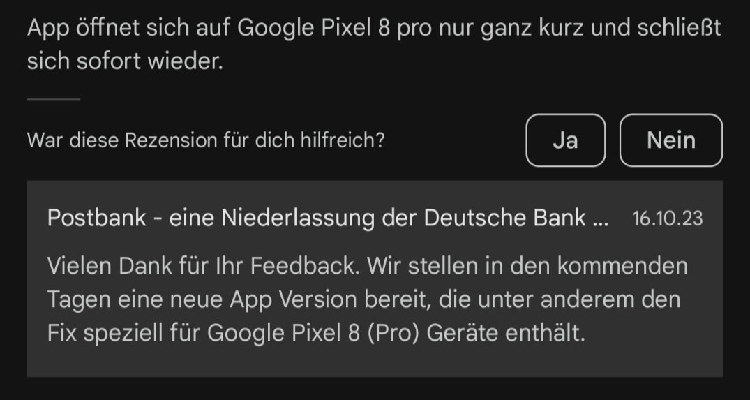 Nun musste ich feststellen, dass die App "Postbank" sich gar nicht öffnen lässt und auch Löschen des Cache, Neustart und Neuinstallation nicht helfen.