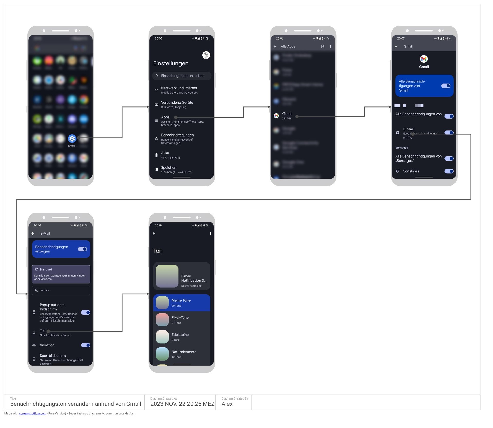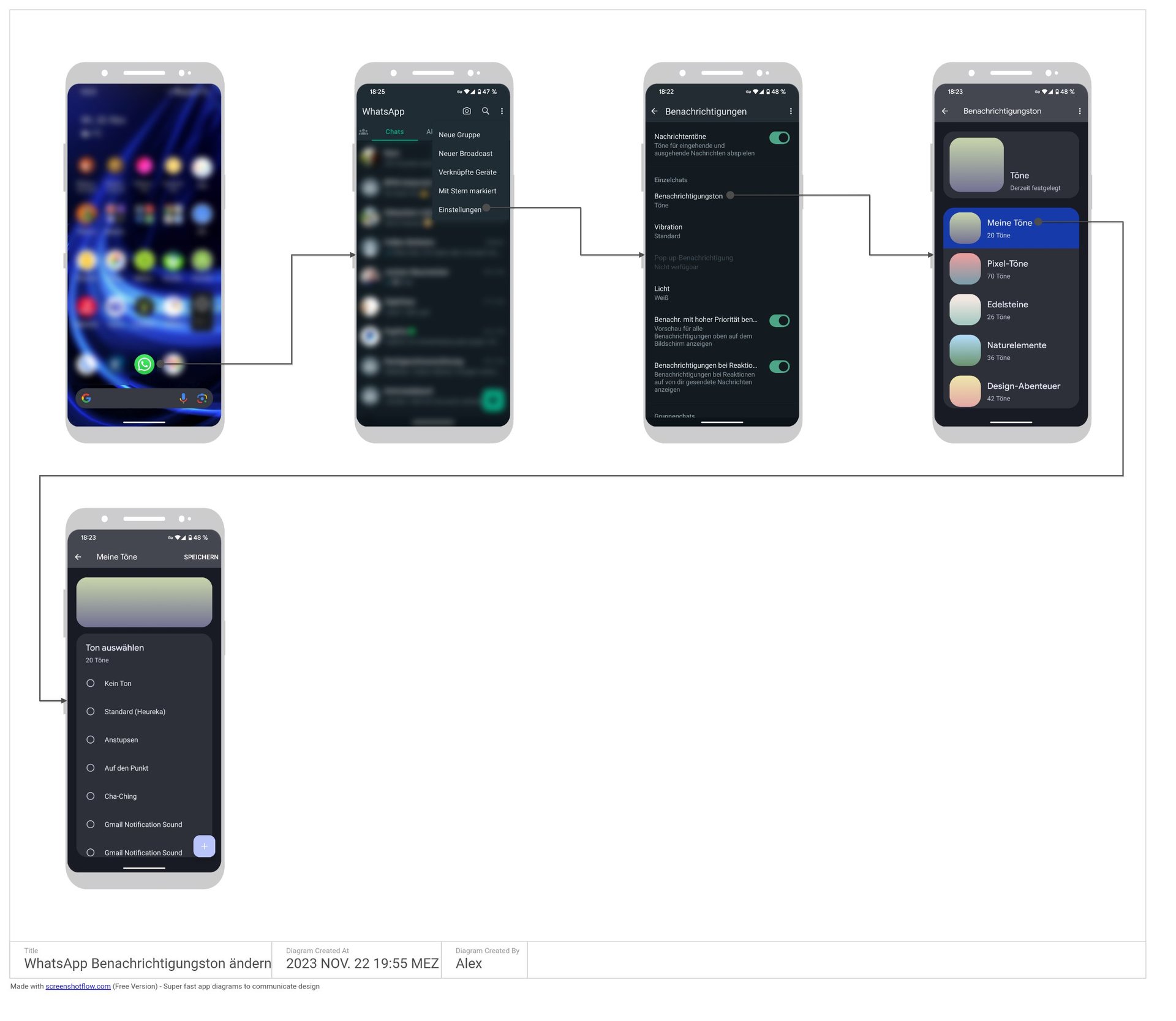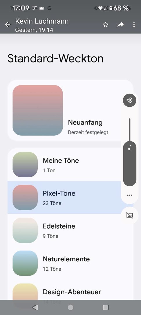 Einstellungen, dann Ton&Vibration, dann z.B. Standard-Weckton und dann kam ein kleines weißes Infofeld mit : Töne, Datei, und noch was.Dann habe ich Töne angeklickt und die Auswahl kam.