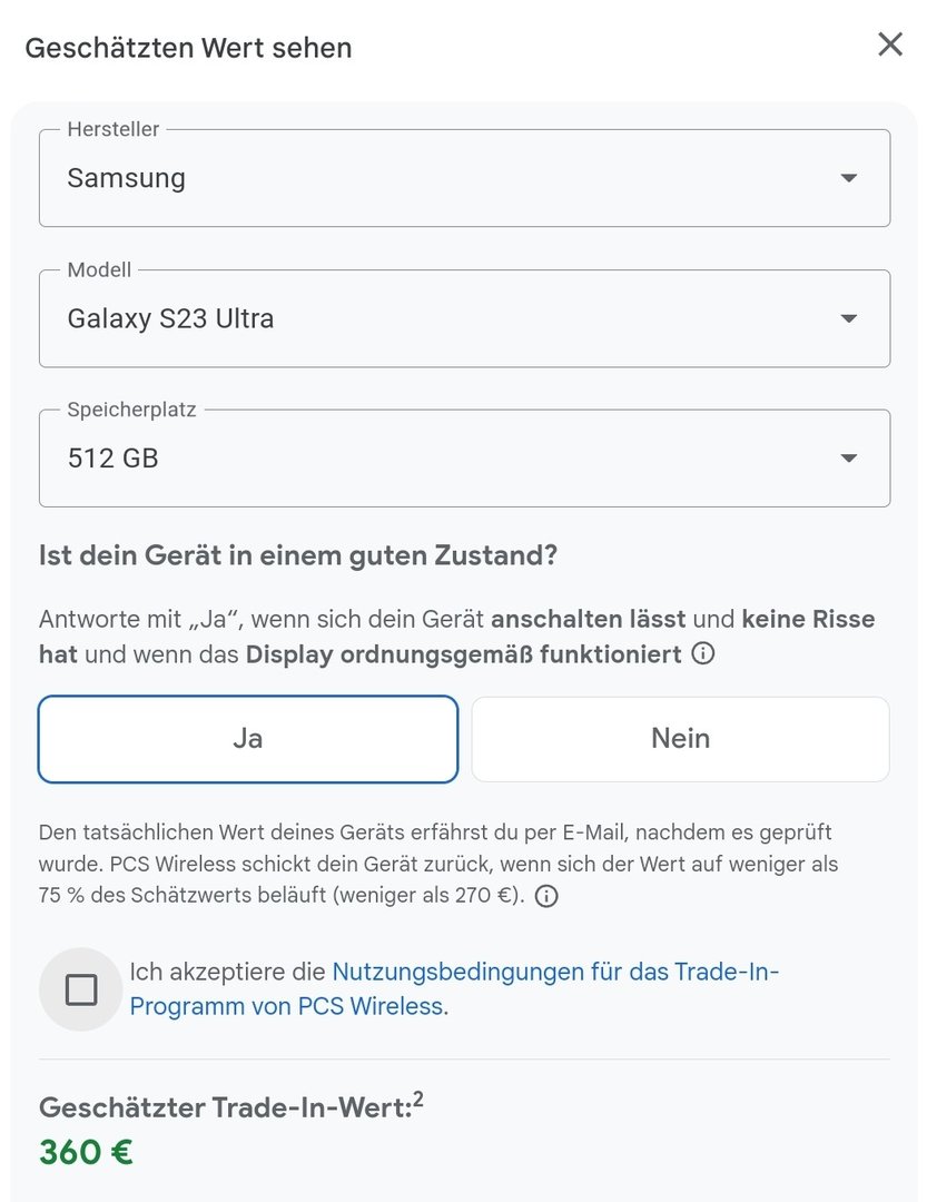 ich habe gerade mal das Trade-In meines Samsung Galaxy S23 Ultra (512GB) im Google Store simuliert (beim Pixel Fold) und bin geradezu erschrocken. Da werden fast 600€ (!) weniger angeboten als aktuell z. B. bei wirkaufens.de