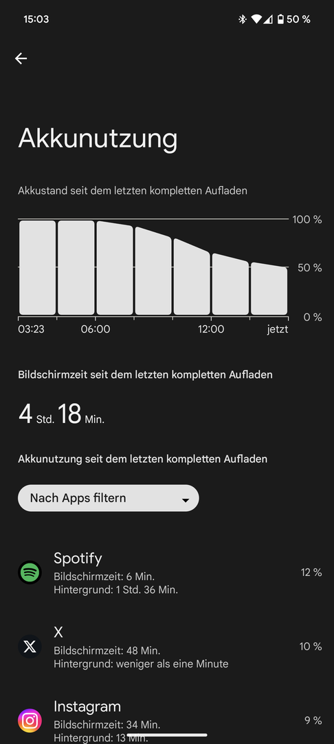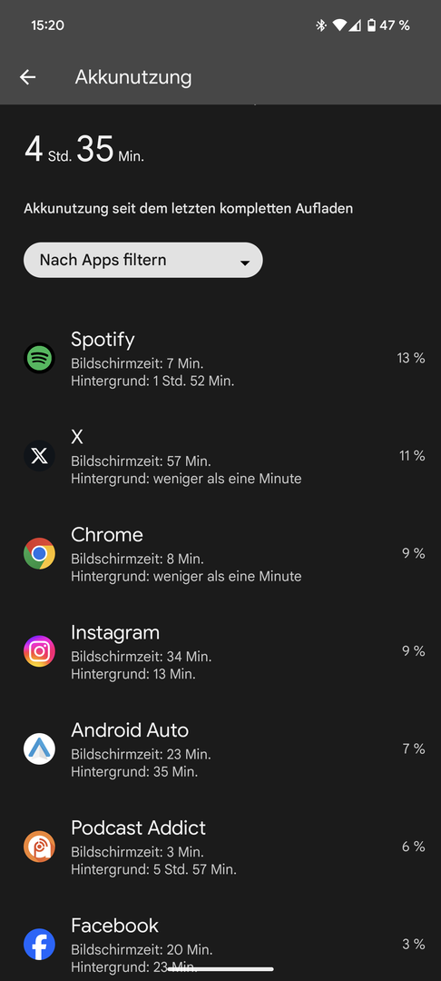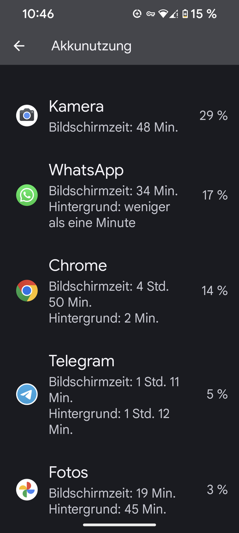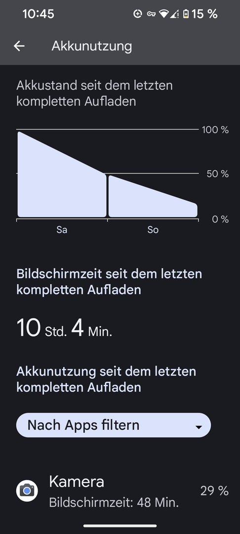 Also bei meinen 9h21 waren paar Apps anmelden und viel YouTube Instagram usw. Dabei. Energiesparmodus ab 20% Display auf Auto und bis auf 2-3h daheim im WLAN mit 5g aktiviert auch wenn es da nicht wirklich genutzt wird. Zusätzlich waren Uhr ( ganztägig) und Pixel buds pro (2-3h) gekoppelt. Kein dunkel Modus oder extrem Display Helligkeit reduziert. Daheim geht das also wohl ohne Probleme.Splitter11 schrieb:Wie nutzt ihr denn die Geräte?