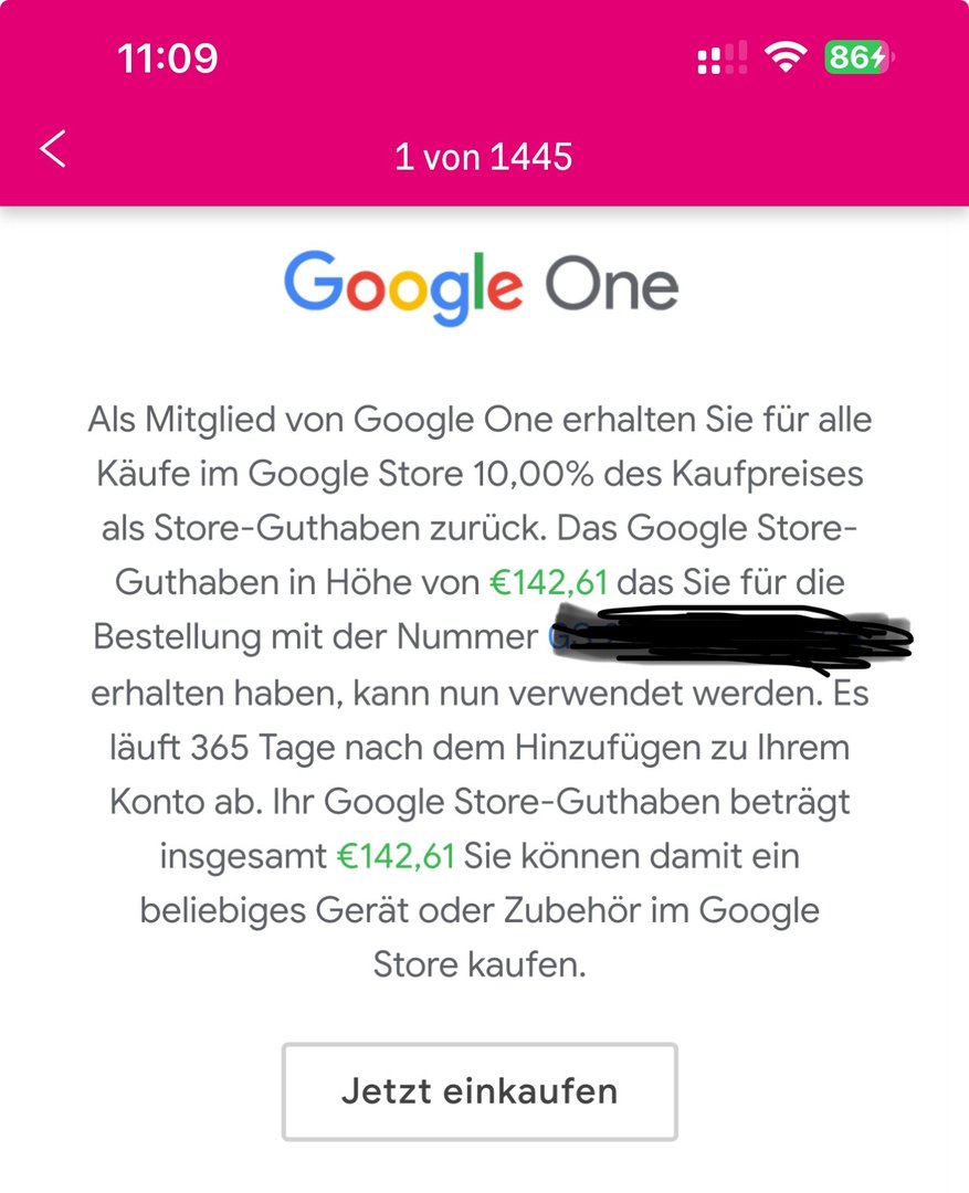 Einer soll das verstehen. Ich kaufe ein 2TB Abo, um 10% Rabatt im Store zu bekommen. Muss aber etwas bestellen, damit es aufgebucht wird und für die nächsten Bestellungen berücksichtigt wird.