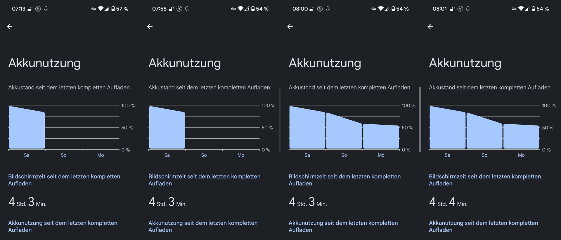 Da die Smartphones während der Nacht standardmäßig aus sind und morgens neu gestartet werden, kann ich schon von einer gewissen Regelmäßigkeit berichten. Auch unabhängig davon, ob nun zuvor voll geladen oder nur noch mit reduzierter Ladung die Geräte ausgeschaltet wurden. Optimiertes Laden und sonstige "Spielereien" nutze ich nicht.