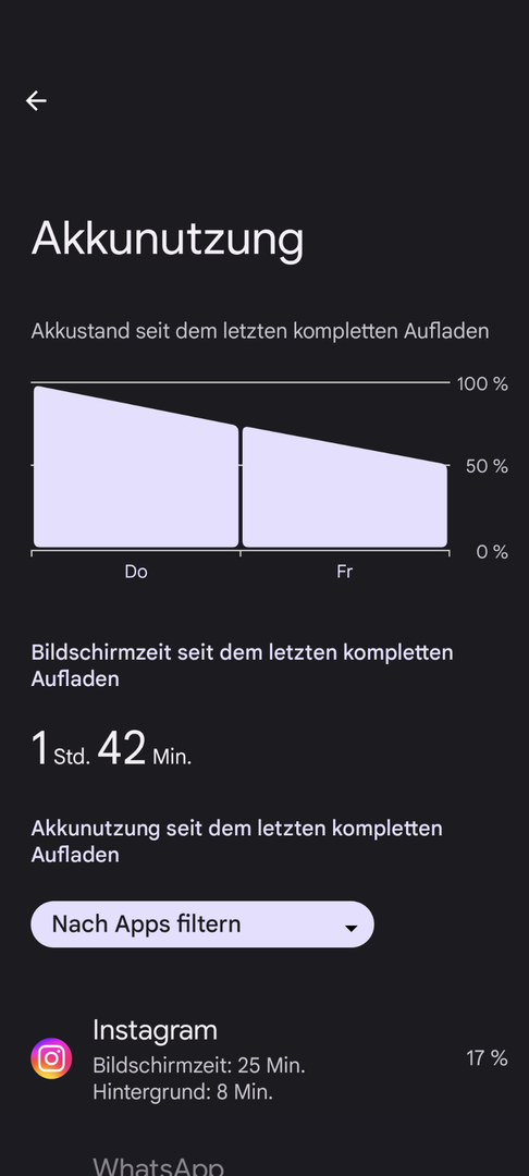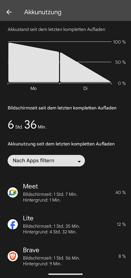 Lehn dich noch ein, zwei Monate zurĂŒck. Die Akkulaufzeit wurde beim 6a googletypisch auch erst stetig besser.Budenmike schrieb:Und das 6a ist leider kein Vergleich. Meine Frau hat das auch und hat die gleiche Erfahrung wie du. Deutlich mehr Akku am Ende des Tages. Deshalb navigiert sie jetzt immer![]()