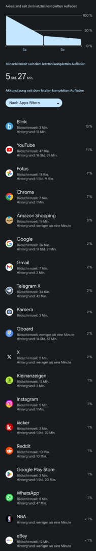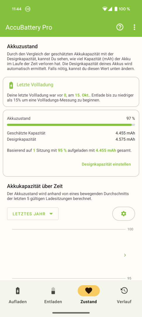 Das ist der vierte Ladevorgang bei meinem Pixel. Von 5-100 geladen und so lange am Netzteil gelassen, bis AccuBattery mir keine Aufladung angezeigt hat.