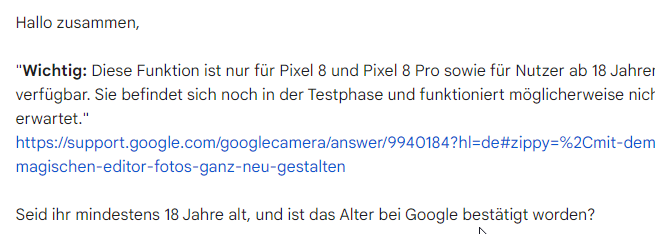 Hi, habe mir ein Google Pixel 8 zugelegt und bin noch nicht 18. Wenn ich Bilder bearbeiten möchten steht da zwar Magischer Radierer und so aber nicht das Symbol für den Magic Editor.