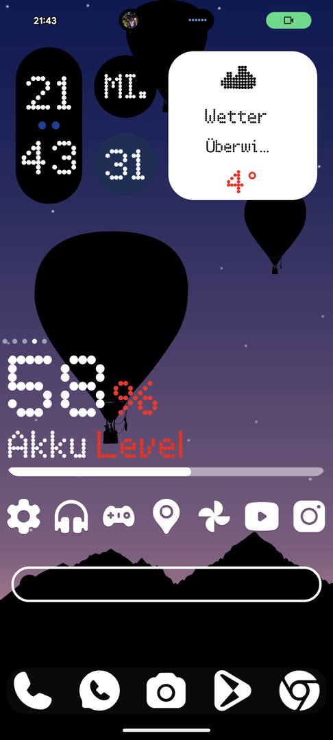 -Auf der ersten Homescreenseite wird oben in der Ecke Wochentag und Datum angezeigt. Beim Druck darauf öffnet der Kalender.