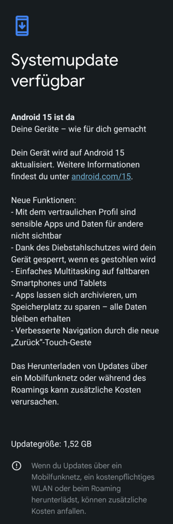 diesen Monat erhalten alle unterstützten Google Pixel-Geräte mit Android 14 das Softwareupdate auf Android 15. Das Update ist schon heute für einige Nutzerinnen und Nutzer verfügbar. Im Laufe den nächsten Wochen wird es nach und nach über die Mobilfunkanbieter auf den Geräten bereitgestellt. Du erhältst eine Benachrichtigung, sobald das Systemupdate für dein Gerät bereitsteht. Wir empfehlen dir, deine Android-Version zu prüfen und auf die neueste Version zu aktualisieren.