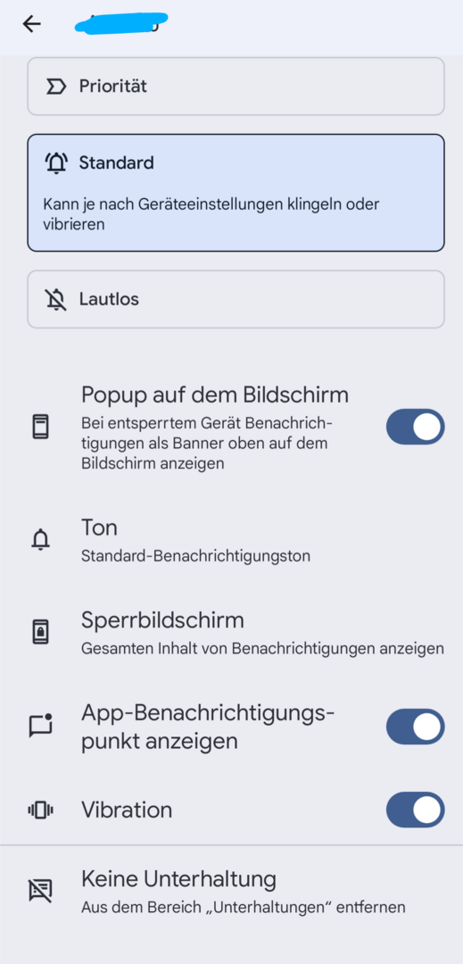 Wenn ich lang auf die Benachrichtigung drücke, kann ich zwar auch zwischen Priorität, Standard und Lautlos wechseln, aber die Benachrichtigung bleibt "Stumme Benachrichtigung" und ich muss auch dennoch separat Ton und Vibration dafür anmachen.