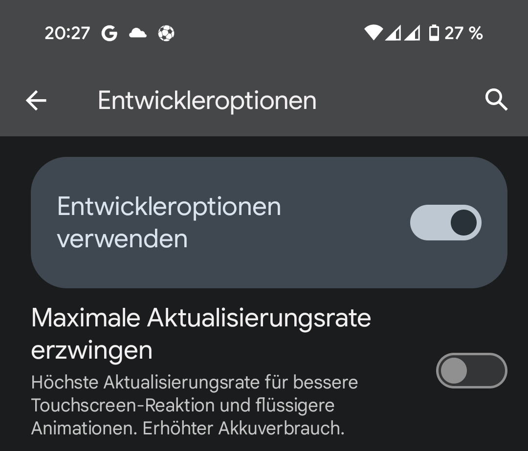 Ne war nicht eingeschaltet. Hab's dann Mal angemacht, aber blieb alles unverändert. AOD 30hz und sonst 120hzphone-company schrieb:@homePC und du hast auch nicht die Entwickleroption aktiviert und dort 120hertz erzwingen ein? Ansonsten mach das mal eben und sieh nach was da steht