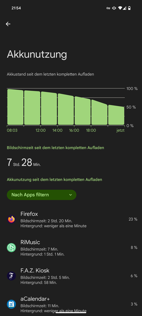 Hier verbraucht es pro 2h Nutzung 10-15 % Akku, was mir sehr zusagt.