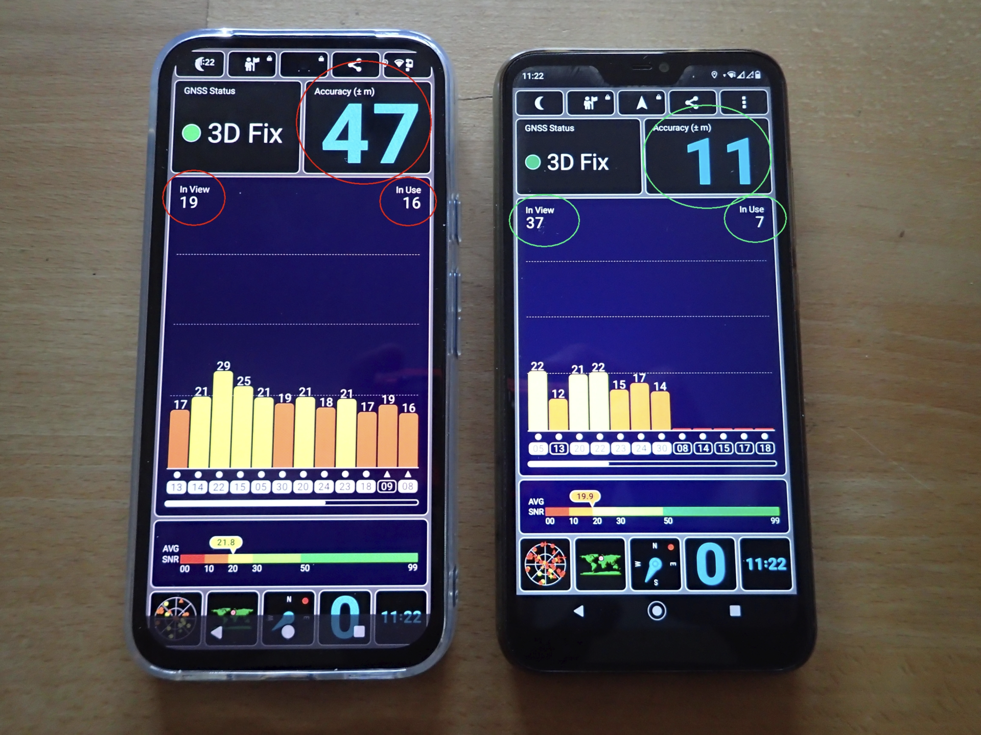 - Das P8a nutzt aber von den gefundenen Satelliten deutlich(!) mehr für die Standortbestimmung (etwa doppelt so viele).