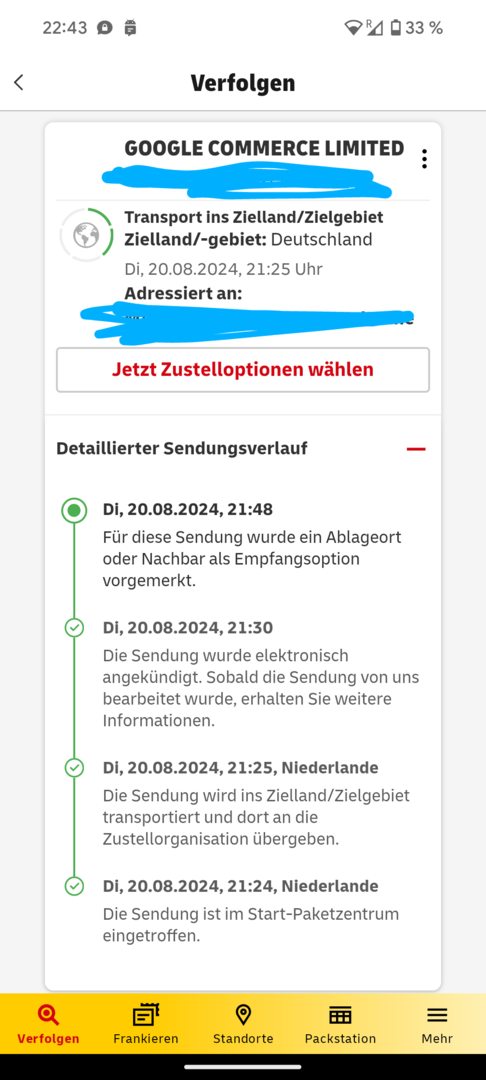 Damit ist es schon einen Schritt weiter als meinsHab's gesehen. Hab leider noch gar keine deutsche Verfolgung... Und bei der Holland-Nummer tut sich nixriffraff4p schrieb:Screenshot ist jetzt aktualisiert, in Post 445