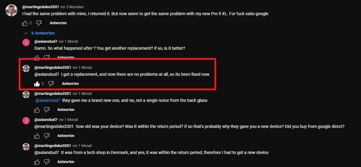 Davon manche auch mit Video. Habe genau den gleichen Ton/Geräusch. Scheint laut Reddit ein Problem mit der Verklebung zu sein. Ist auch von Google als Garantiefall anerkannt und ein neues ist schon Unterwegs. Im Chat meinte der gute Herr auch, dass dies wohl in späteren Revisionen/Production Runs gefixt worden sei. So stehts auch in neueren Reddit Posts und dem Kommentar aus dem Video.