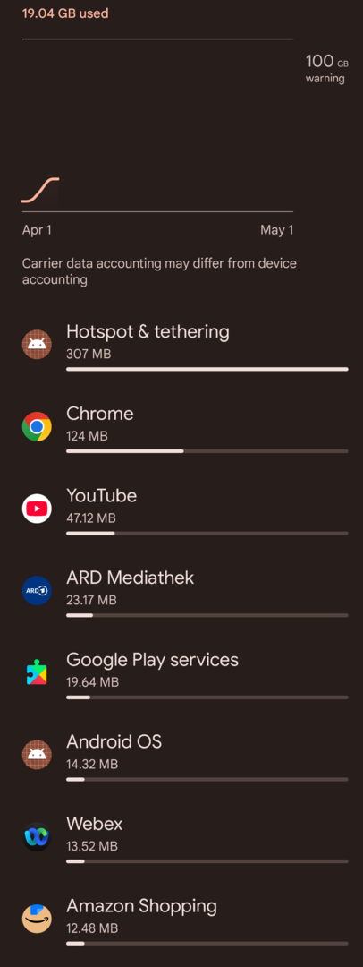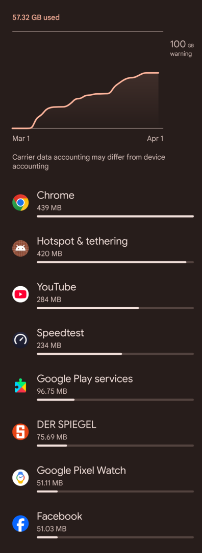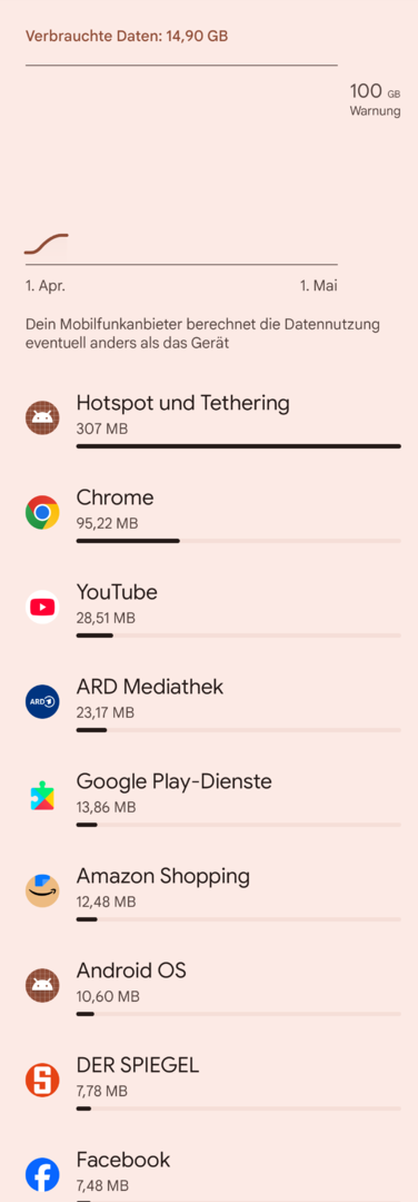 ich habe heute festgestellt, dass irgendwas auf meinem Gerät enorme Daten verbraucht, ohne dass das an den entsprechenden Stellen nachvollziehbar wäre. Der Datenzähler unter mobile Daten kommt mir bei den einzelnen Apps eher zu niedrig als zu hoch vor. Ich füge einen Screenshot von heute morgen (hell) und heute abend (dunkel) ein, laut dem ich über 5 GB verbraten haben soll. Auch seltsam, dass die Kurve nicht wie sonst ganz unten beginnt. Insgesamt wären es heute 7. Ich habe das Gerät normal genutzt und vorhin ne Stunde YT laufen gehabt. Keine Backups oder App-Updates im Hintergrund. Der Datenzähler beim Provider zeigt mir (leider) das selbe. Habe heut morgen die App My Data Manager geladen; die zeigt bei den Apps ungefähr das gleiche, aber mit einem Gesamtverbrauch von unter 200 MB statt 5 GB.