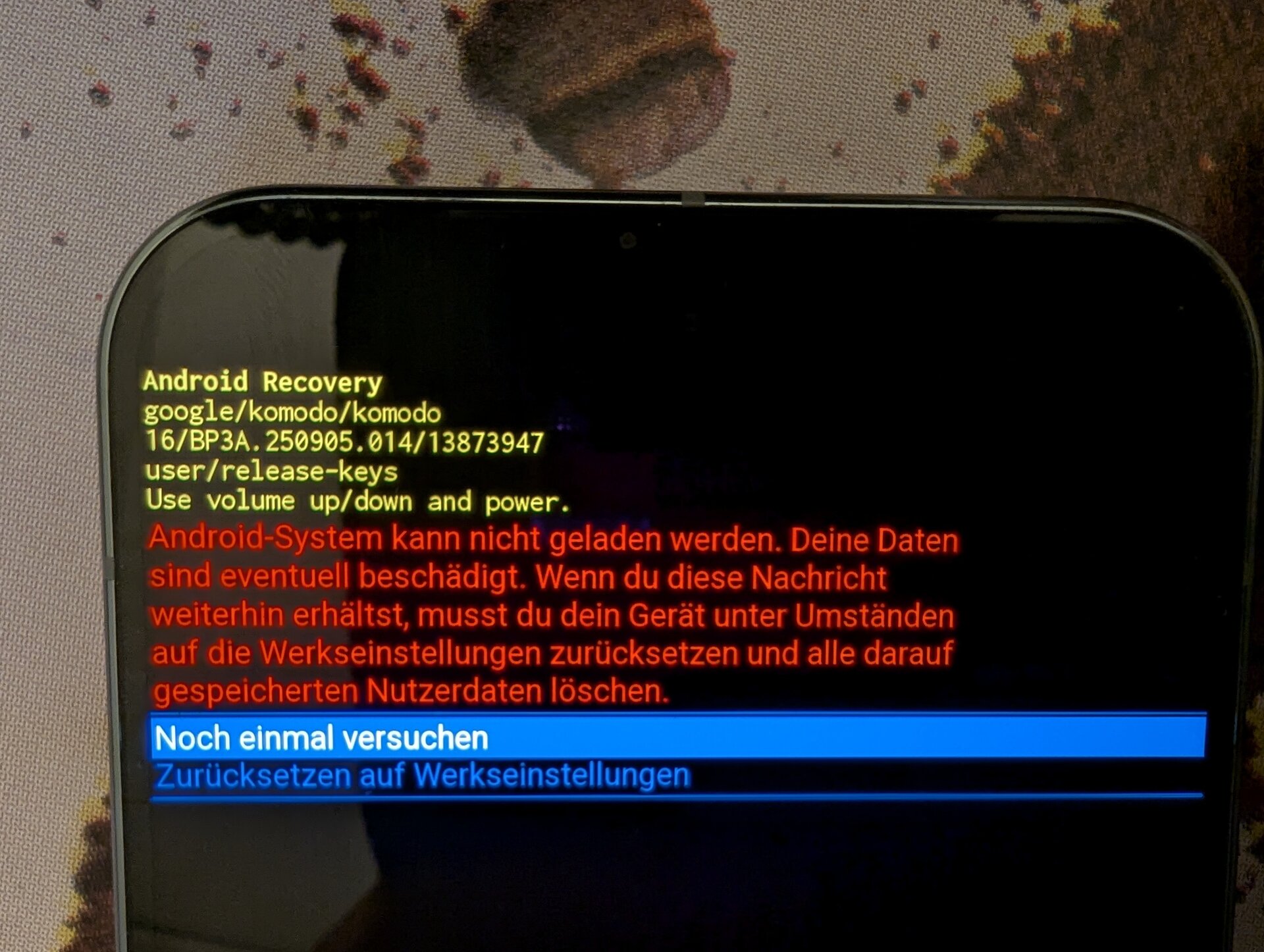 Dieses lief nun anstandslos bis gerade eben (also etwa 2,5 Monate) und plötzlich genau das gleiche! Restart-Loop bis es in den Recovery Modus kommt.