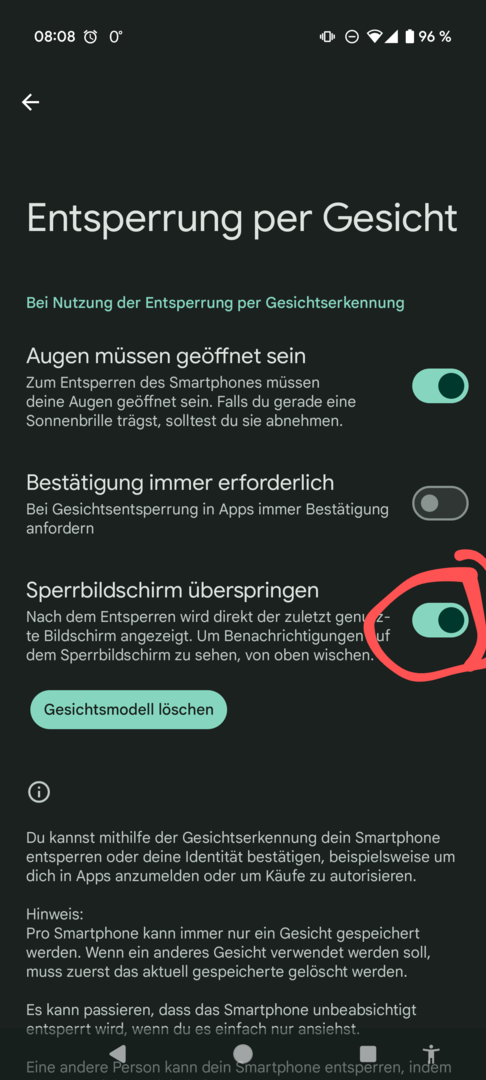 Gesichtserkennung und 2 Fingerabdrücke sind hinterlegt, zusätzlich eine PIN.