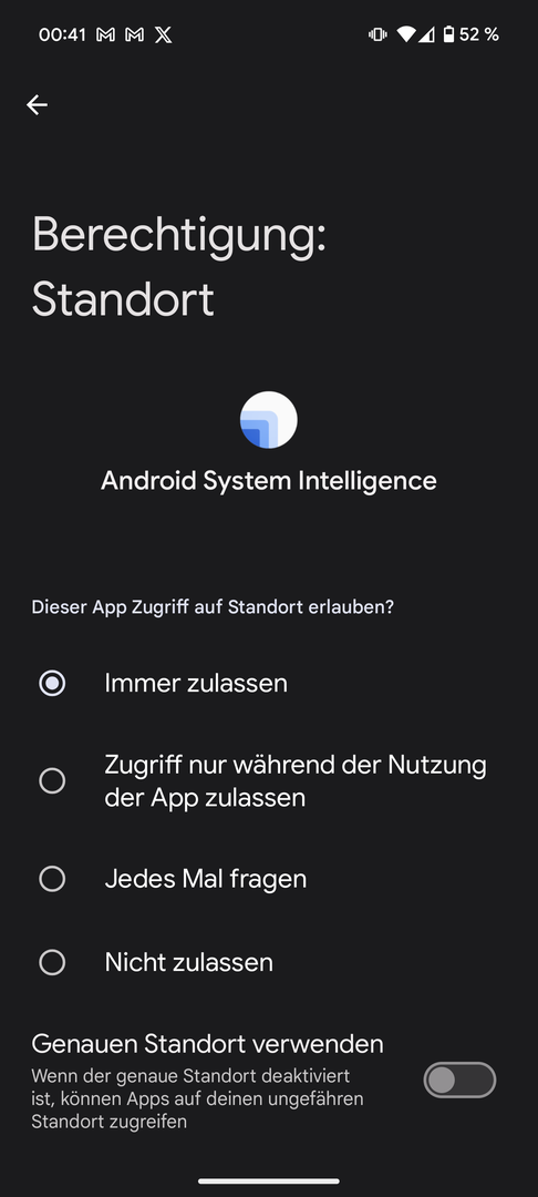 Jedoch hat android system intelligence zu meiner Verwunderung nicht den Zugriff auf den genauen Standort ab Werk sondern diese Option ist aus.