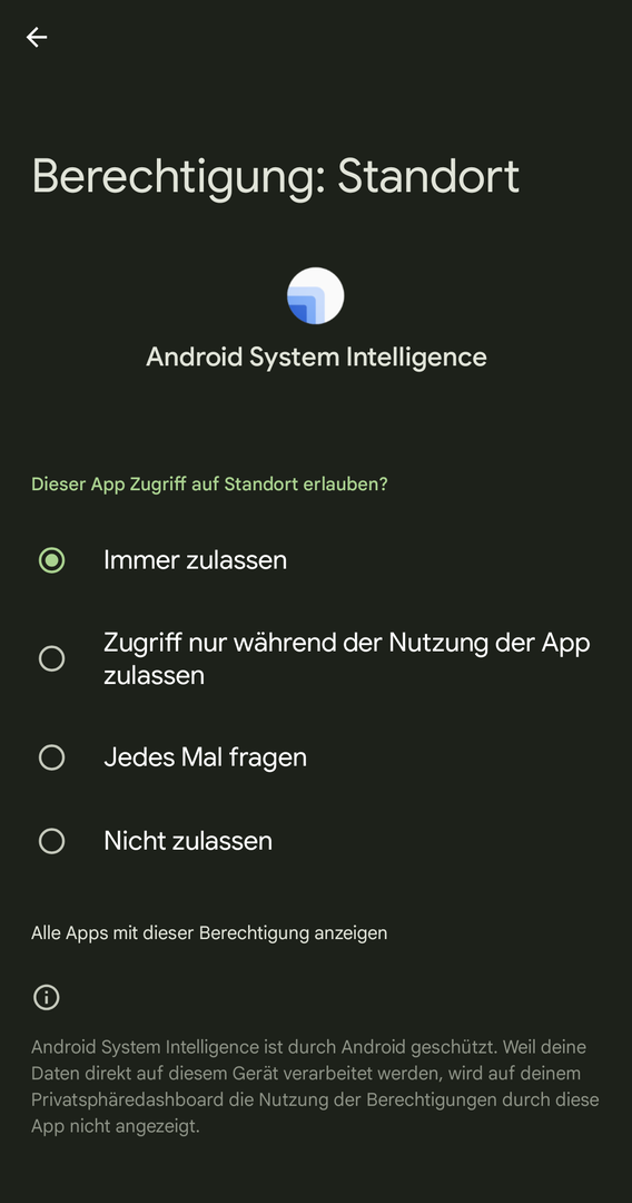Android System Intelligence hat normal immer Standortzugriff.