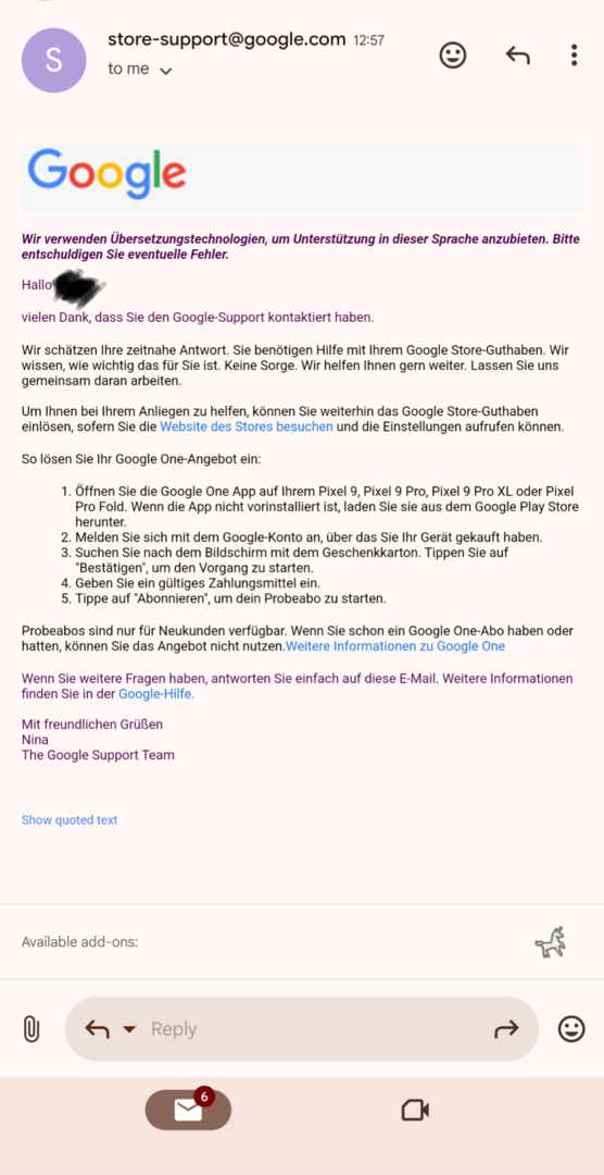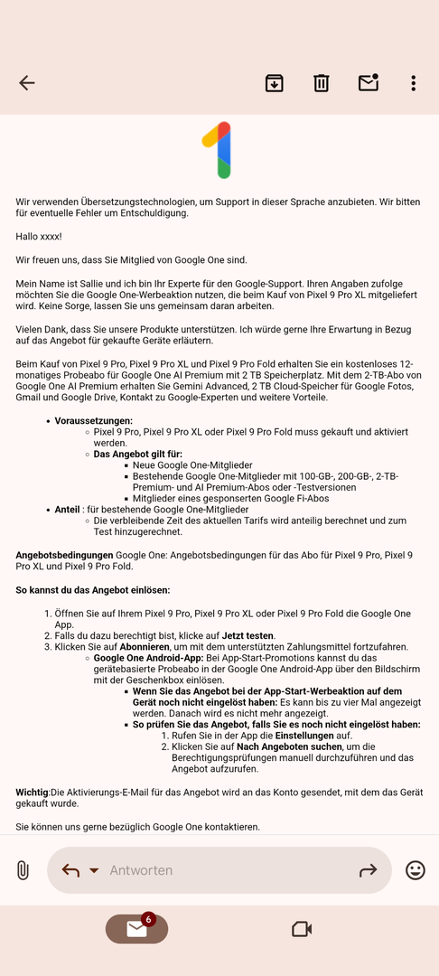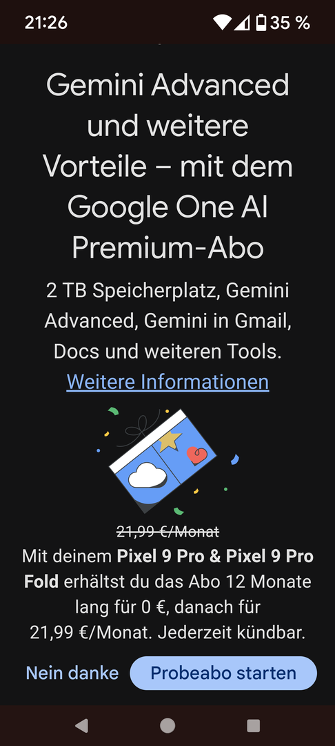 Zur Klarstellung: Sobald Sie die kostenlose Testversion auf Ihrem Pixel 9 Pro eingelöst haben, wird die verbleibende Zeit des aktuellen Abos anteilig berechnet und zum Testabo hinzugerechnet.
