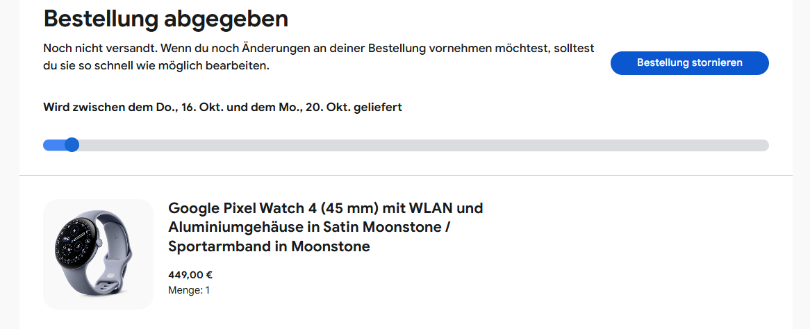 Steht bei dir auch Zustellung am 18.10? Ich habe mir die moonstone in 45 mm bestellt. Genau da bin ich im Urlaub....inzaghi75 schrieb:Bei Amazon gibt es die Moonstone 45mm LTE für 487€. Habe da jetzt zugeschlagen und 2 Bänder bei Google bestellt. 100€ gespart. Kommt halt ne Woche später...