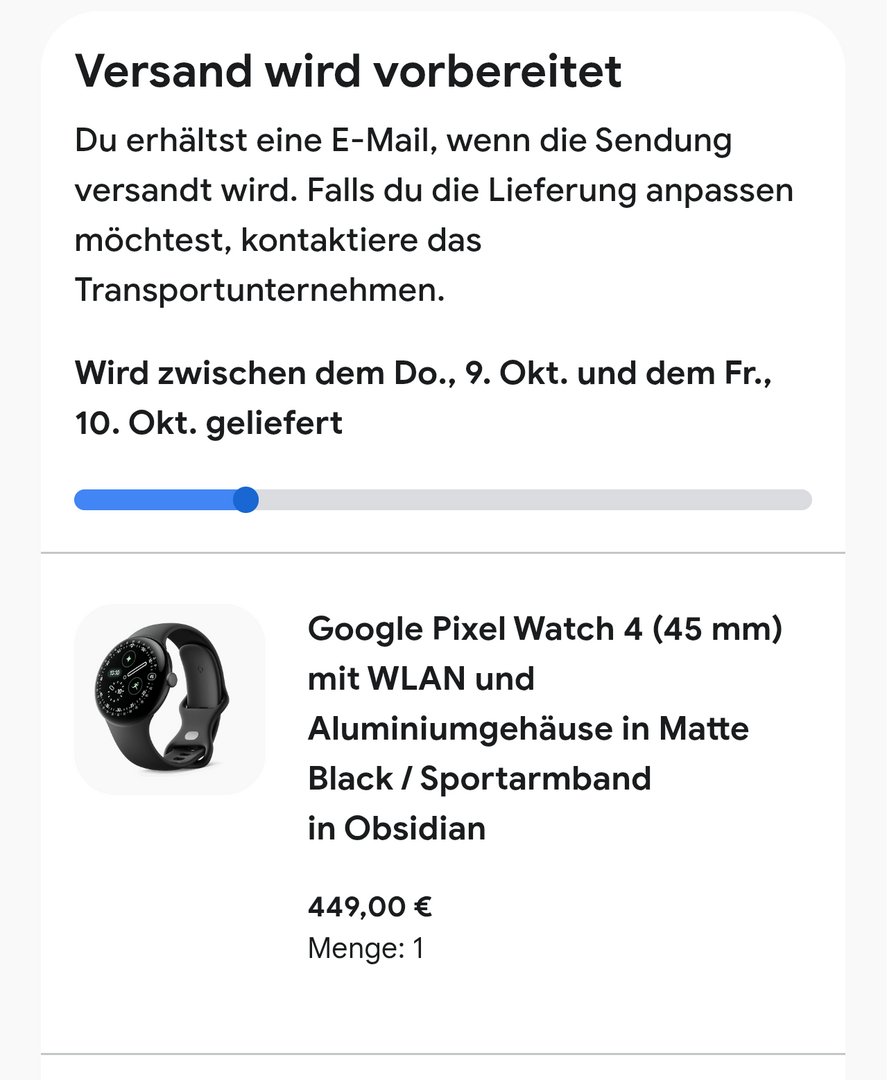 Meine soll erst Freitag kommen. Ich gehe davon aus, dass sie Donnerstag da ist.Scoop schrieb:Habe am 29. September bestellt. 45 mm in schwarz, WLAN, voraussichtlich 09. bis 10.